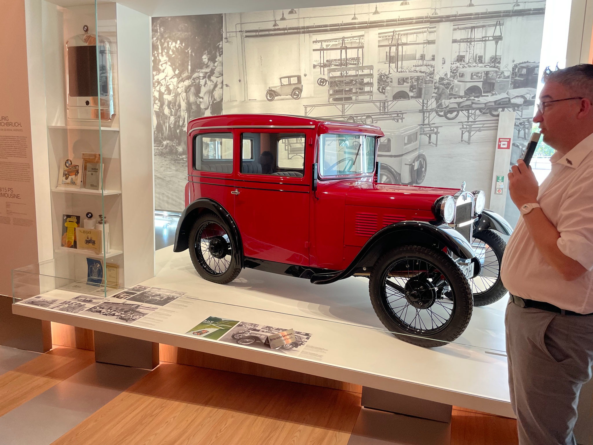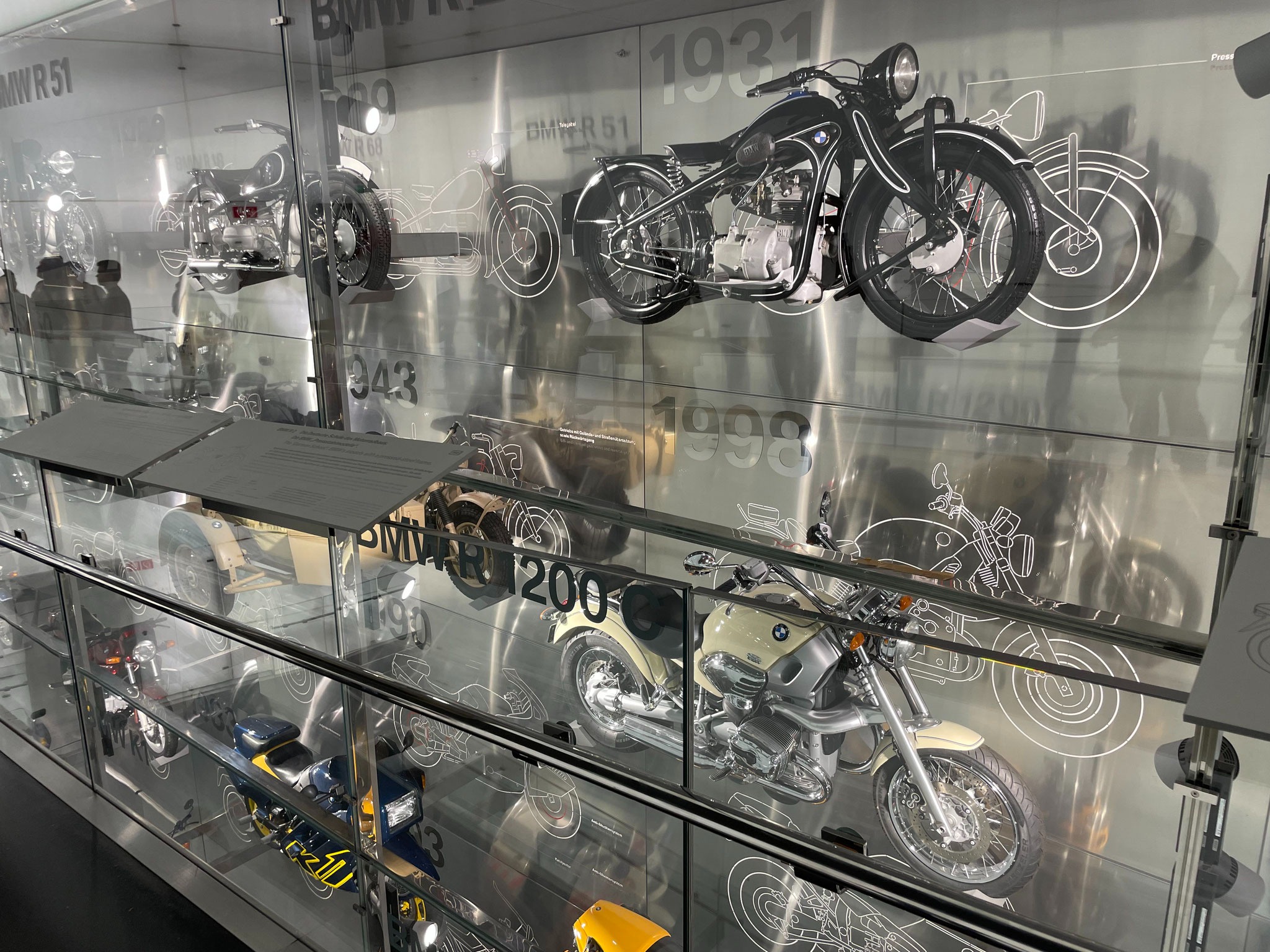 Am späteren Vormittag sind wir in München und können pünktlich mit der Führung durch die Hallen des modern angelegten Museums beginnen. Die Geschichte der Bayrischen Motorenwerke BMW beginnt vor rund 100 Jahren im Jahr 1917 als Gmbh. Zuerst wird der Flugmotor „BMW Illa“ gebaut, welcher sich im Jagdflugzeug „Fokker D. VI“ so bewährt, dass gerade zwei tausend Motoren bestellt werden durch die Heeresverwaltung. Nach dem ersten Weltkrieg darf BMW keine Flugmotoren mehr bauen. 1923 wird das erste Motorrad entwickelt: mit Boxermotor und Kardanantrieb im Doppelrohrrahmen. Ab 1924 baut BMW wieder Flugmotoren, ab 1928 Fahrzeuge im thüringischen Eisenach. Der Kleinwagen „Dixi“ ist das erste Serien-Fahrzeug, als modifizierter Lizenz-Bau des britischen „Austin Seven“. 1932 folgt der „AM 1“ als erster „echter“ BMW.